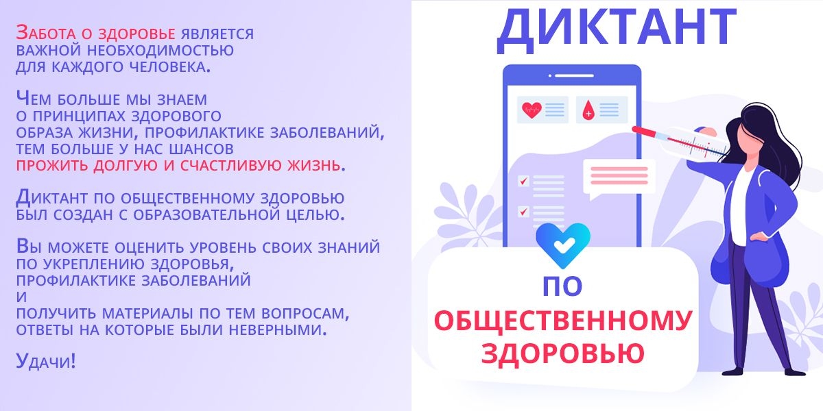 Обеспечение охвата всех граждан страны профилактическими медицинскими осмотрами и диспансеризацией — важная часть нацпроекта «Здравоохранение». Диктант здоровья позволит повысить знания населения в направлении профилактики и ранней диагностики заболеваний, а также узнать подробнее о факторах риска, которые вредят здоровью.