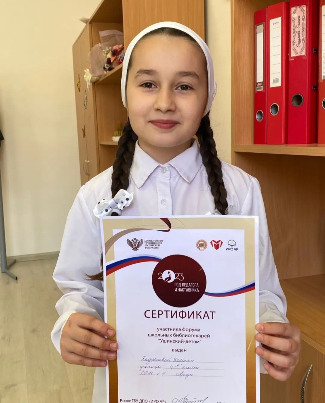 Ученица 4 "а" класса МБОУ "СОШ №7" г. Аргун Хаджиева Ясмина приняла участие на форуме школьных библиотекарей к 200-летию К. Д. Ушинского "Ушинский - детям", на котором выступила с исполнением произведения К. Д. Ушинского "Жалобы зайки"